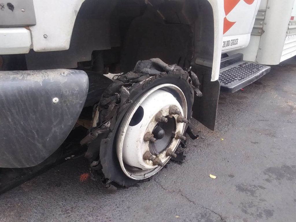 Po przybyciu na miejsce zauważeniu trzech pojazdów i rozeznaniu się w sytuacji, trzech antyfaszystów podkradło się do ciężarówek i zaczęło je unieruchamiać. Trzej kierowcy podjęli słabe próby powstrzymania sabotażu. Frederick OR i inny kierowca podeszli do grupy antyfaszystów, ale gdy ci wezwali ich, aby ośmielili się podejść bliżej, wycofali się; tymczasem trzeci kierowca z niepokojem wykrzyknął: „Nagrywamy was!”. Niestety dla niego, trudno jest nagrać wyraźny materiał wideo, gdy się ucieka w ciemności wokół ciężarówki U-Haul. Nic dziwnego, że nie ma żadnej wzmianki o takim nagraniu na wewnętrznych czatach Patriot Front po tym wydarzeniu.