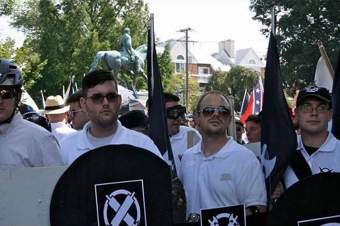 Na zdjęciu 20 letni Jamies Field Jr (w środku z okrągłą tarczą), należący do neonazistowskiej organizacji „Vanguard America” odpowiedzialny za morderstwo 32 letniej Heather Heyer