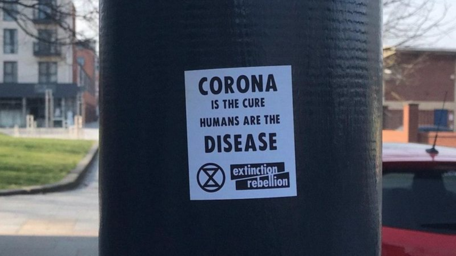W marcu konto, które twierdziło, że reprezentuje lokalny oddział Extinction Rebellion, zamieściło zdjęcie naklejki z niebezpiecznym hasłem: „korona [koronawirus] jest lekarstwem — ludzie są chorobą”. Biała supremacjonistyczna grupa znana jako Hundred-Handers wyprodukowała naklejki i rozpowszechniła je.