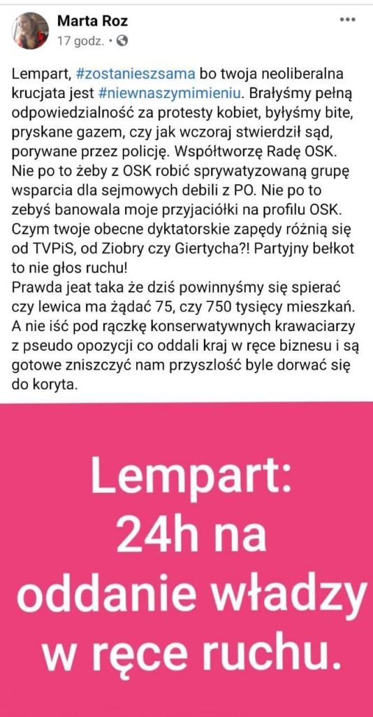 Co prawda, pierwsze sygnały o tym, że coś jest nie tak i że możemy spodziewać się najgorszego po liderkach OSK, docierały już wcześniej, niebezpiecznie dużo pojawiało się tam członków KO. Nikt nie spodziewał się jednak, że OSK wykorzystane zostanie ostatecznie, do tak bezpardonowego ataku, z pominięciem ogromnego zaangażowania lewicy w sprawy kobiet – które ta podkreśla od początku swojego istnienia.