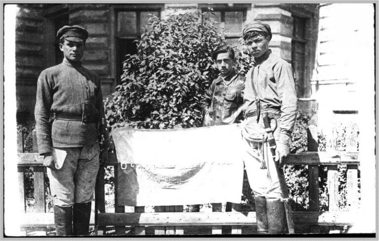 Oryginalne archiwalne zdjęcie flagi przedstawia ją trzymaną w górze przez dwóch żołnierzy z szablami przed dużym kamiennym budynkiem. W ZSRR zdjęcie po raz pierwszy pojawiło się w publikacji Zełmana Ostrowskiego z 1926 r. zatytułowanej „Pogromy żydowskie, 1918-1921”[6] Książka dokumentowała wybuch antysemickiej przemocy w czasie wojny domowej, w wyniku której według współczesnych szacunków zginęło ok. 50 000 Żydów[7].