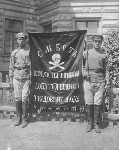 W tym kontekście po raz pierwszy pojawia się flaga z czaszką i kośćmi, będąca częścią wczesnych sowieckich wysiłków mających na celu wizualne powiązanie Machna z pogromami Żydów poprzez strategiczne wykorzystanie zapadającego w pamięć symbolu i hasła.