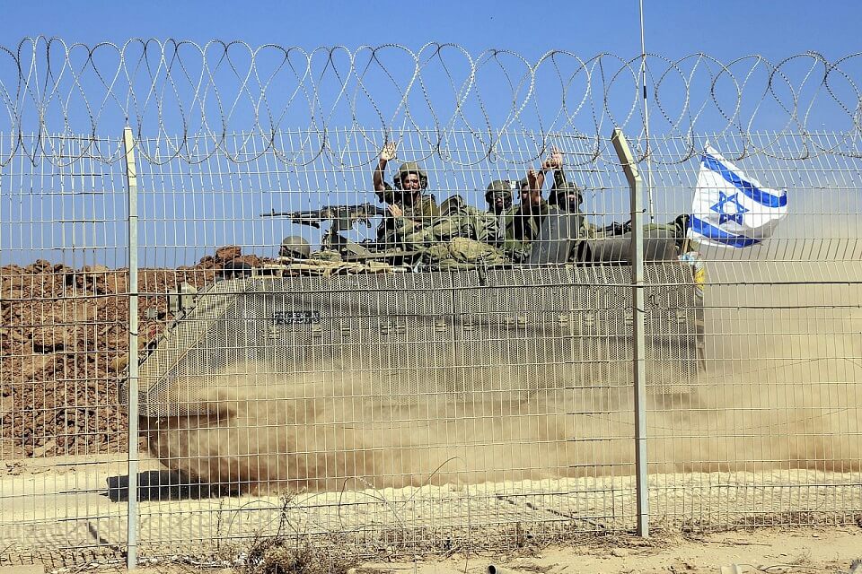 Izraelscy żołnierze widziani za ogrodzeniem kibucu Be’eri, w pobliżu ogrodzenia Izrael-Gaza, południowy Izrael. 25 października 2023 r. (Yossi Zamir/Flash90)