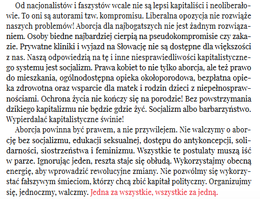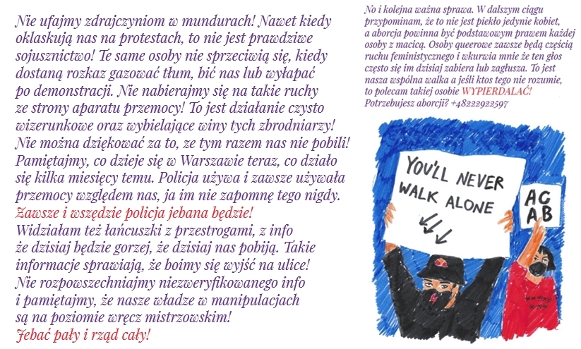„Wszędzie tam, gdzie działają dziewczyny/osoby na rzecz LEGALNEJ, BEZPIECZNEJ ABORCJI NA ŻĄDANIE, może zdarzyć się zastraszanie, spisywanie, wizyty policji, hejt, kłamstwa lokalnych mediów, manipulacje, najazdy trolli na wydarzenia… Opowieści o „zabijaniu dzieci”, oskarżanie o wandalizm, o desakralizację kościołów. W małych miasteczkach padają wielkie słowa i wielkie oskarżenia. Nie pozwólmy, by którakolwiek z nas była z tym sama!”- cytat z jednego z wydarzeń solidarnościowych.