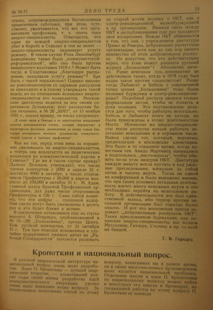 Współczesne wydarzenia prowadzą nas w kierunku decentralizacji państw i federacji narodowości. Oczywiste jest, że nie jest to ostateczny ideał, poza który uciskana ludzkość nie wyjdzie, ale nie jest to sprzeczne z podstawowymi ideami anarchistycznej doktryny autonomicznego i federacyjnego życia narodów, a wręcz przeciwnie, jest w doskonałej harmonii z głównymi zasadami anarchizmu. I w tej sprawie musimy mieć nadzieję, że pełne rozwiązanie kwestii narodowej zostanie zrealizowane nie bez wpływu anarchistycznych idei Piotra Kropotkina.