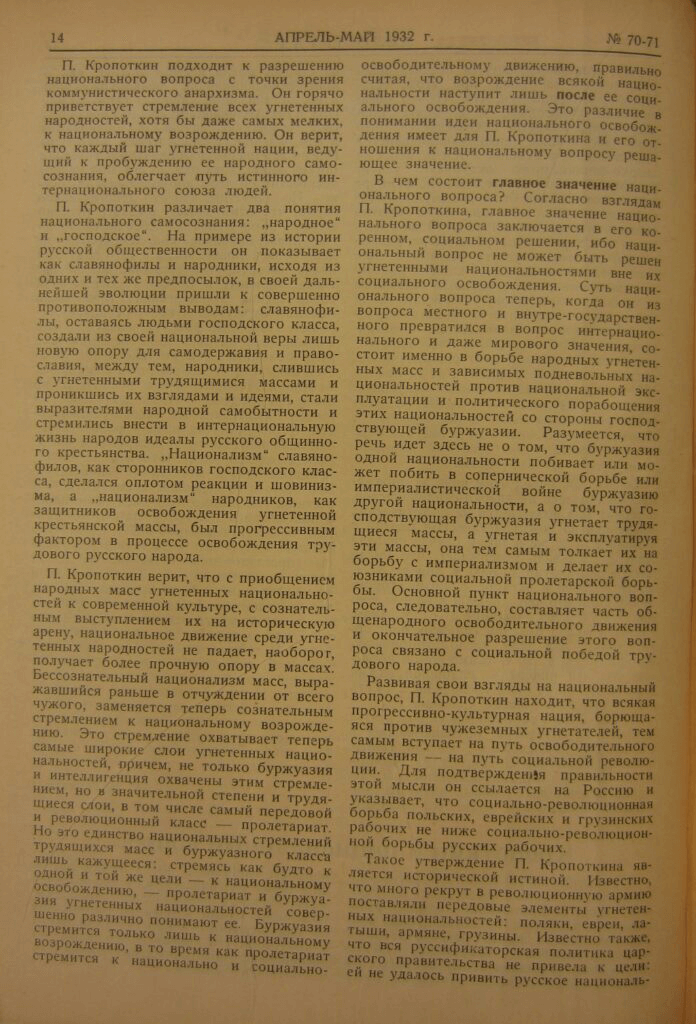 Kwestia narodowa jest bardzo słabo rozwinięta w rosyjskiej literaturze anarchistycznej. Nawet Piotr Kropotkin, najlepszy teoretyk anarchizmu, który poświęcił wiele lat swojego życia na rozwijanie idei komunistycznego anarchizmu, poświęcił tej kwestii bardzo niewiele uwagi. Z wyjątkiem kilku artykułów na ten temat, napisanych przez niego w różnym czasie, w swoich licznych pracach niewiele porusza problemy narodowe. Pojedyncze myśli i idee Piotra Kropotkina dotyczące kwestii narodowej można znaleźć w niektórych jego książkach i broszurach, ale Piotr Kropotkin nie napisał na ten temat odrębnego dzieła.