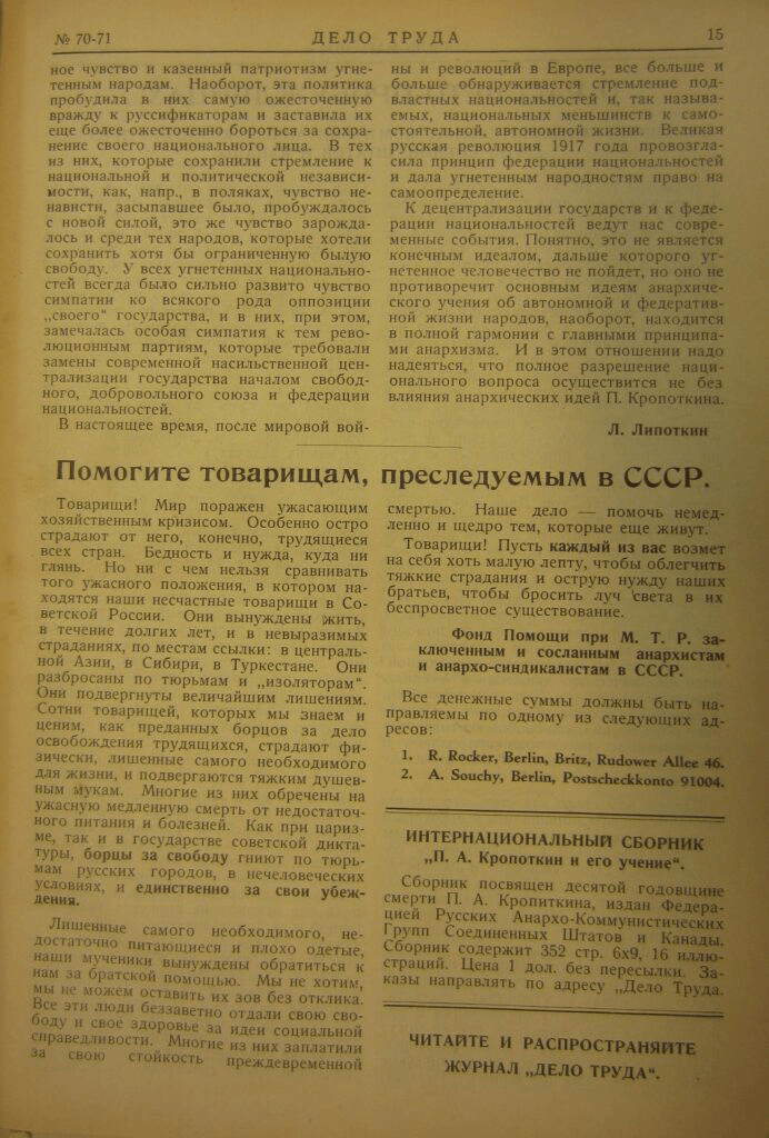 Wielu współczesnych ludzi nazywających siebie anarchistami ignoruje lub zaniedbuje kwestię narodową i refleksję nad problemem walk narodowowyzwoleńczych. Głównym argumentem jest dla nich oklepane odwoływanie się do „klasyków teorii anarchistycznej”, którzy rzekomo nie zwracali uwagi na problem uciskanych narodów. W związku z tym projekt Akrateia opublikował artykuł rosyjskiego anarchisty Lazara Lipotkina (pierwotne źródło: gazeta »Delo Truda«, wydanie z kwietnia-maja 1932 r.), w którym zwięźle, ale zasadniczo opisuje on stanowisko Piotra Kropotkina, najbardziej klasycznego filozofa anarchistycznego. Artykuł wydaje się niezwykle istotny w kontekście oświeconej walki z bezrefleksyjnym wypaczaniem poglądów klasyków anarchizmu w kwestii wspierania zniewolonych narodów i ich walki z obcym uciskiem.