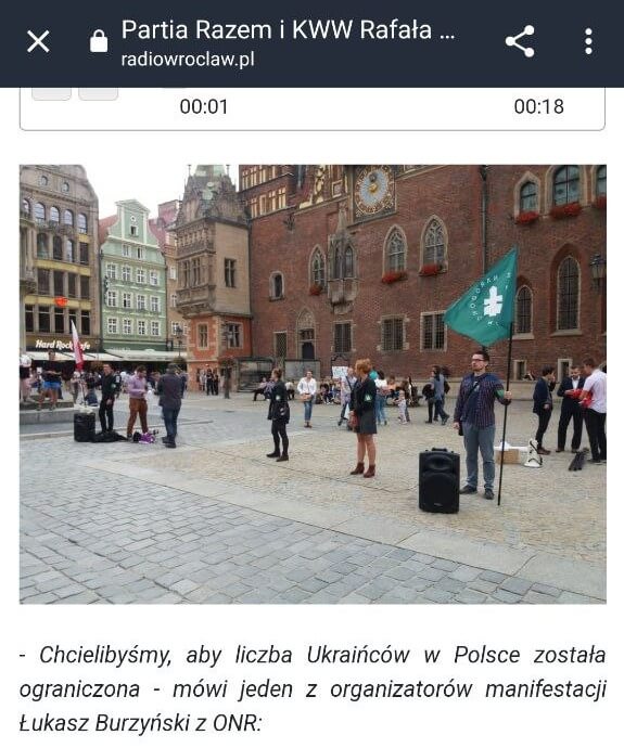 „Gdy chcemy skorzystać z usług, jak sklepy, banki, ubezpieczalnie i inne instytucje, nie możemy wtedy często porozmawiać po polsku. To przez obywateli Ukrainy, którzy pracują w Polsce, mamy dziś niskie pensje. Pracodawca nie zgodzi się na podwyżki, bo może sobie znaleźć tańszego pracownika z Ukrainy – pod koniec 2018 roku czytał z kartki Łukasz Burzyński, będący wówczas członkiem wrocławskiego ONRu.