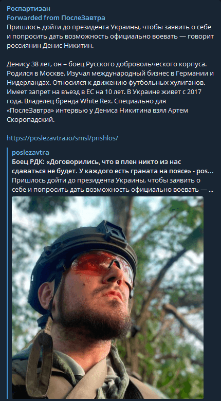 Denis już wtedy miał bardzo dobre powiązania z wieloma skrajnie prawicowymi grupami w wielu krajach, głównie dzięki sieci MMA „White Rex”. Aktualnie Nikitin walczy po stronie ukraińskiej jako jeden z dowodzących Korpusem Rosyjskich Ochotników. Jego oddział jest ideologicznie powiązany z wcześniej wspomnianym Viktorem Larionovem i jego „Rosyjskim Centrum” i nie jest do końca znana liczba skrajnie prawicowych Rosjan, którzy tworzą oddział. Członkowie Korpusu Rosyjskich Ochotników walczą z Rosją, która „niszczy Rosjan jako grupę etniczną” i używają emblematu nazistowskich kolaborantów Rosyjskiej Armii Wyzwolenia z 2WŚ. Żaden to „Legion Wolności”. Motywem Denisa Nikitina jest coś bardzo zbliżonego o czym wspominał Denis Tiukin. Nikitin także widzi możliwości organizowania się na terytorium Ukrainy jako ugrupowania nacjonalistyczne, które podejmą walkę z Kremlem. Interesującym jest, że Denis Nikitin wspomina o tym, jak musiał osobiście tłumaczyć Zełeńskiemu o co mu chodzi, aby móc oficjalnie włączyć się do walki. W międzyczasie wspomina o tym, że Korpus zostanie włączony w oficjalne struktury wojskowe Ukrainy. W wywiadzie powyżej linkowanym, Nikitin rozmawia z członkami rosyjskiej grupy oporu „Pojutrze” (PosleZavtra). Nawiązują do włoskiego faszysty Stefano Delle Chiaie. To ugrupowanie , zupełnie jak Korpus Rosyjskich Ochotników są połączeni za pośrednictwem kanału rosyjskiej grupy oporu „Rospartizan”.
