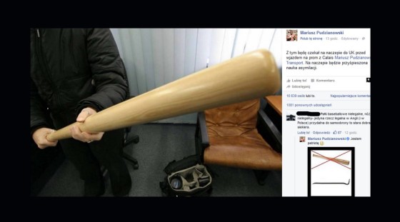 Opis do powyższego zdjęcia na profilu Pudzianowskiego głosi: „Z tym będę czekał na naczepie do UK przed  wjazdem na prom z Calais Mariusz Pudzianowski Transport. Na naczepie będzie przyśpieszona nauka asymilacji”. Oprócz tego wpisu, Mariusz pokusił się o dodatkowe komentarze, takie jak: „PS. nie mam litości – śmiecie ludzkie!!!!! Mnie tam dać!! nie pożałuje bejsbola zero tolerancji!!! Ludzie jaka tolerancja?????? Ja już nie mam tolerancji dla tych śmieci – co niby nazywają się ludźmi!!!!! Niedługo sam przejadę się do UK promem z Calais i poczekam na nich w naczepie.Mariusz Pudzianowski Transport.”
