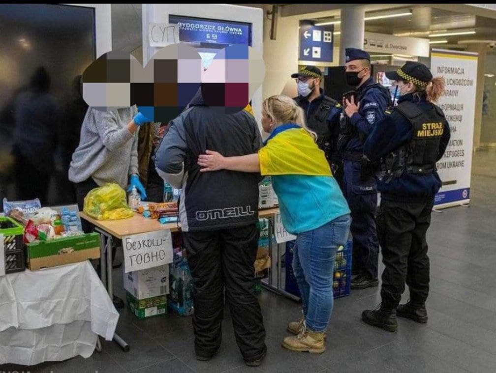 - W trakcie rozstawiania się z bezpłatnym jedzeniem i napojami dla uchodźców z Ukrainy (około 15 prywatnych osób) przyszedł patrol SOK z policją, z informacją, że nie wolno się nam tu rozstawiać, bo nie ma zgody zarządcy budynku, czyli PKP. Zarządca dworca powiedział, że to jest w kwestii wojewody, Urząd Wojewódzki odsyła nas z powrotem do zarządcy dworca… Koniec końców mówimy, że my tu zostajemy, a oni niech robią co chcą. Pojawia się jakiś dziennikarz, są robione zdjęcia, sytuacja staje się niezręczna i patrol odchodzi, ale cały czas krążą do około nas….