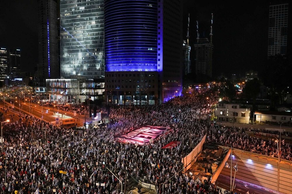Od miesięcy w Tel Awiwie i innych miastach odbywają się cotygodniowe masowe demonstracje, które w każdą sobotę przyciągają dziesiątki tysięcy osób. Jest to jeden z największych ruchów społecznych w historii Izraela. Protesty rozpoczęły się po inauguracji najbardziej skrajnie prawicowego rządu, jaki kiedykolwiek rządził tym krajem; szybko skupiły się na sprzeciwie wobec reformy sądownictwa, która skonsolidowałaby władzę w rękach rządu kosztem sądu.