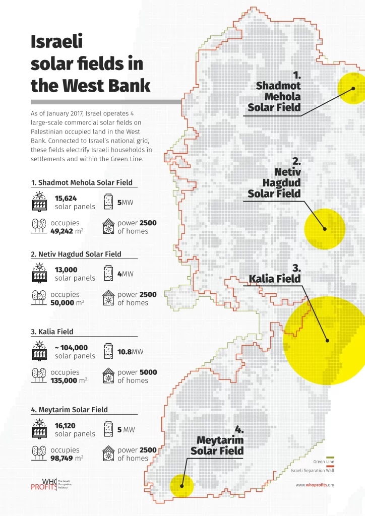 W ciągu ostatnich kilku lat Izrael nielegalnie zbudował cztery komercyjne elektrownie słoneczne na Zachodnim Brzegu, trzy w Dolinie Jordanu i jedną na południowych zboczach gór Hebron. Wszystkie cztery elektrownie są podłączone do izraelskiej sieci energetycznej i dostarczają zieloną energię do Israel Electric Company (IEC).